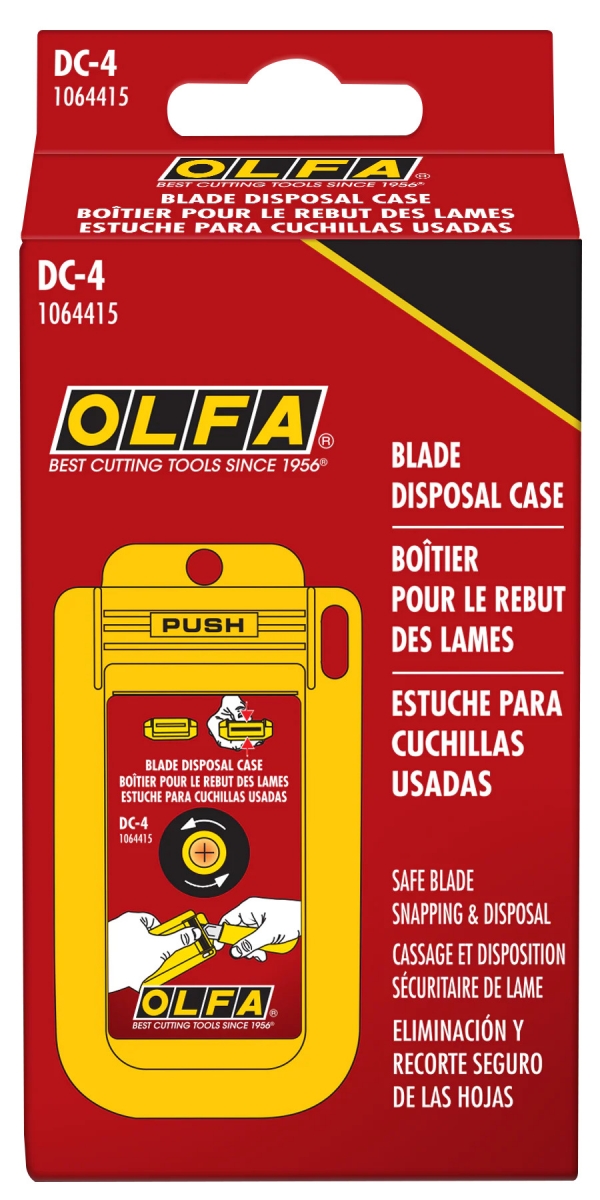 Snaps 9mm and 18mm blades Accepts utility and safety blades for disposal Mounting hole for storage Snap and Dispose Blades Safely Use the OLFA DC-4 Reusable Blade Disposal Can with Mounting Hole to dispose of blades with quick ease. This handy disposal system can snap 9mm precision blades or 18mm utility blades. The canister traps the used segments for safe disposal. The screw safe system prevents used blades from falling out. The press-and-release operation makes sure the container is only open when in use. Use the mounting hole for easy storage or keep one in your toolbox. Accepts Safety Blades (RSKB, SKB) and 25mm utility blades. Snaps and stores 18mm utility blades or 9mm precision blades. (DC-4, #1064415) Snaps: (200) 9mm Blades / (2,600 Edges) (50) 18mm Blades / (400) Edges (10) 25mm Blades / (70) Edges Stores: (30) SKB Blades (100) RSKB Blades UPC: 091511400809
