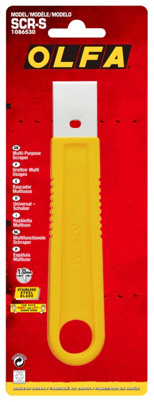 25mm stainless-steel blade Durable ABS construction Textured handle for control Acetone resistant Includes blade cover for safety Narrow Scraper Ideal for Tight Spaces The OLFA 25mm Multi-Purpose Scraper gets into those tight spaces for optimal scrapping power. This handy tool includes a premium stainless-steel blade that prevents rust and offers easy clean-up. The narrow one-inch-wide head easy navigates a variety of jobs including decals, gaskets, paint, window film, vinyl, residues or adhesives, and more. The sturdy ABS handle with molded texture grooves helps the hand keep a firm grasp to power through any task. With its acetone-resistant design, clean up is never an issue. A hang hole in the base of the handle allows for storage or tethering. A slide-on blade cove is included for safe storage. This disposable scraper is the solution for any scraping jobs, including floors, glass, tile, walls, and more. (SCR-S, #1086530) UPC: 091511400717