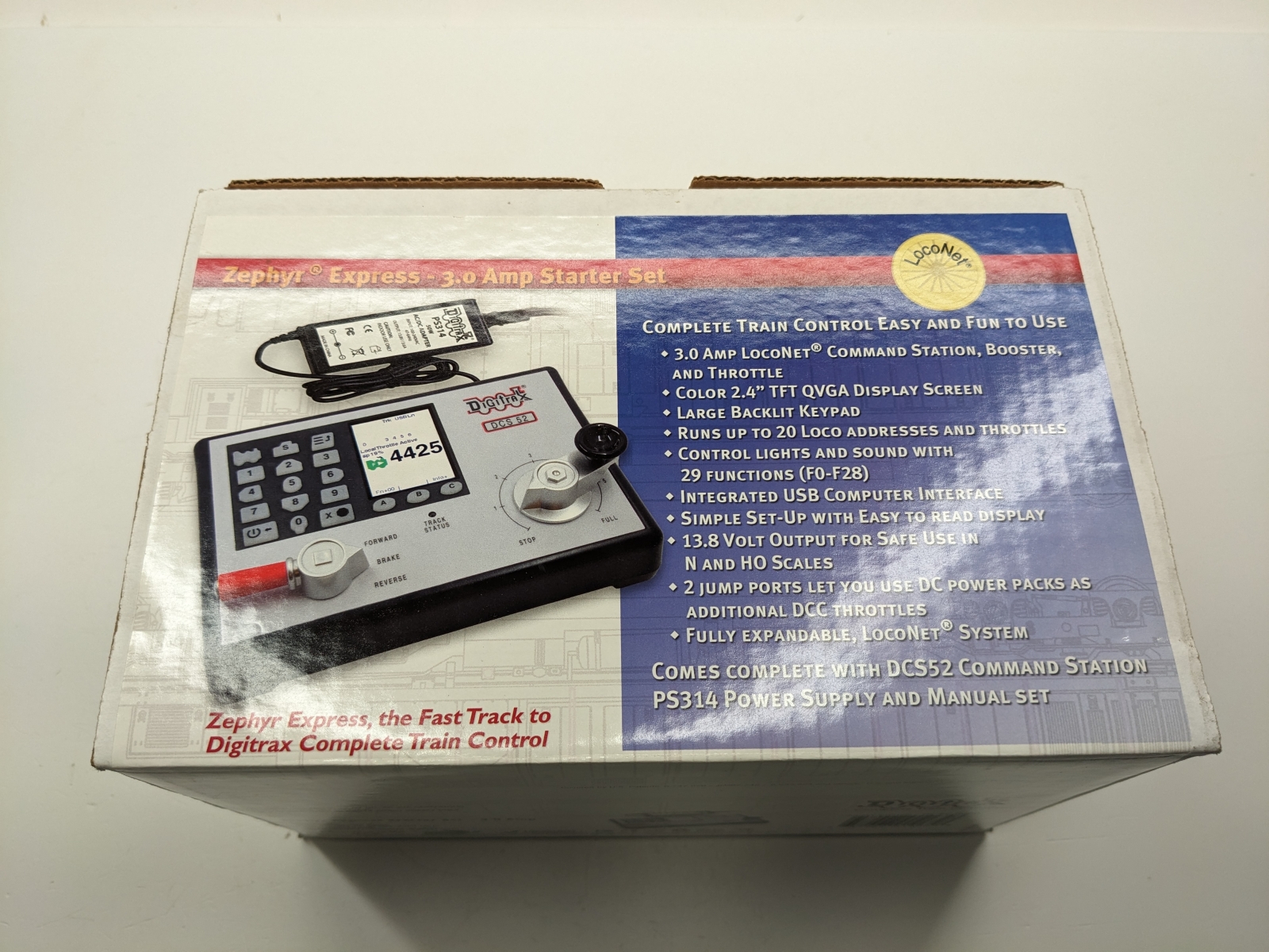 Zephyr Express gives you simple to use Digitrax Complete Train Control for a great price. It offers simplified advanced train operation for any size layout and is fully expandable. You won’t have to start over when you want to do more with your railroad. Zephyr Express Set Includes: DCS52 All-In-One Throttle/Command Station/Booster to run your layout PS314 Power supply to provide power to run your DCS52 Zephyr Express Quickstart Guide Zephyr Express Manual Zephyr Express Offers: Cost effective entry level LocoNet Compatible system Color 2.4” LCD Screen. Large Backlit Keypad. Speed control knob and direction switch with brake. Integrated USB Computer Interface Easy 2 and 4 digit addressing. Smooth speed control. Run multiple trains at once without blocking! Run up to 20 addresses at the same time on your system. Run up to 20 throttles at the same time on your system. Jump Ports for using DC power packs as additional throttles Use one or two smooth DC power packs as throttles to control DCC equipped locomotives. Simple, cost effective way to add more throttles to your Zephyr Express set. Makes it easy to share the fun of DCC with layout visitors and young operators. Functions on locos controlled by Jump throttles remain active. Over 9000 Locomotive Addresses Use Address 00 to run one or more locos without DCC decoders Two Digit Addressing is easy to use. (Address 01-127) Four Digit Addressing-use the number painted on your engines as its address. 3.0 Amps of Power to run multiple trains. Booster outputs 13V DC for safe operation in N and HO scales. Function Control Control lights and sound with 29 functions (F0-F28) Function 2 is a special non-latching key that can be used to sound the horn for as long as the key is held down. Constant brightness lighting. Headlights can be directional or independently controlled (depending on decoder). Stationary Decoders, Turnout Control & Turnout Position Reporting Access to stationary decoder control for turnouts and other devices. Control 2000+ stationary decoder addresses. Consisting Universal consisting, Digitrax preferred method. ALL locos can be consisted, even analog locos. Advanced consisting, allows only advanced consist capable mobile decoders. Basic consisting, program decoders to run on same address. Decoder Programming Built in read/write programmer that can read and write all CVs. Supports Direct programming (Digitrax preferred method). Also supports paged & register mode programming. Operations mode programming can be used to program decoders on the layout. Expandability with Digitrax LocoNet Use Zephyr Express as a starting point for your Digitrax LocoNet System, then add components. Use Zephyr Express as an expansion set with Digitrax equipment you already have installed. Add Radio or IR via LocoNet. Just plug-in a UR90, or UR92 receiver and add IR and/or Radio throttles. Comes Complete with DCS52 Command Station, PS314 Power Supply, and System Reference Manual. UPC: 652667010658