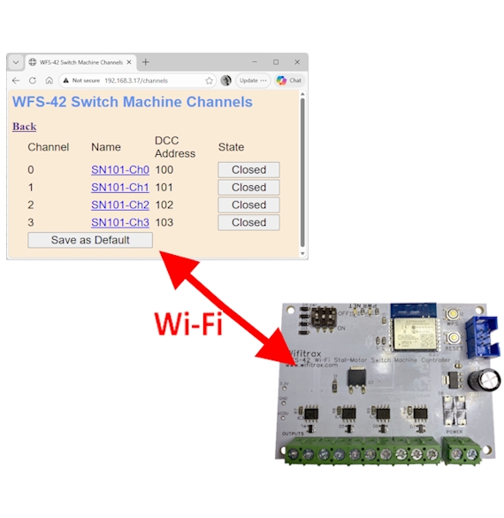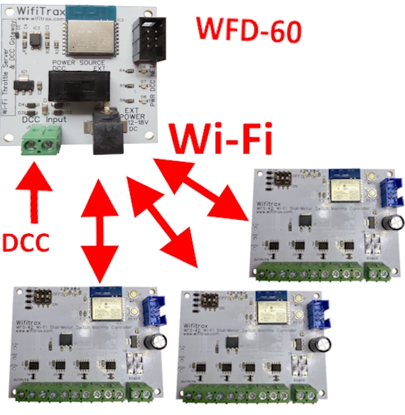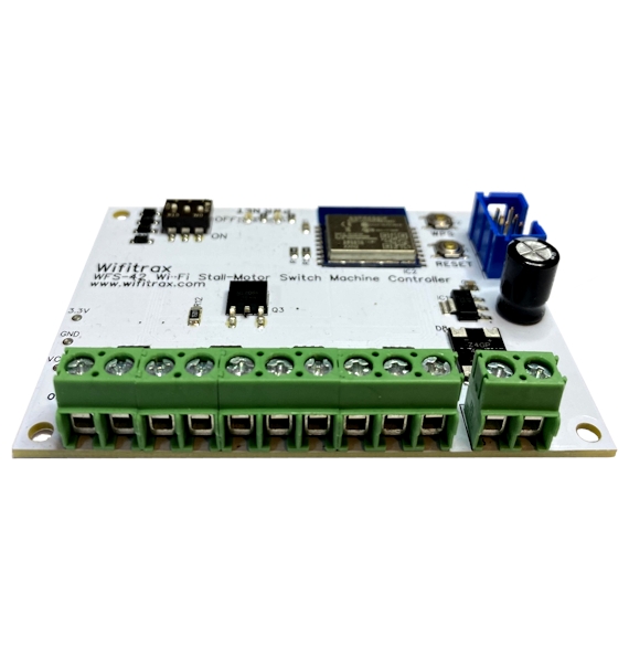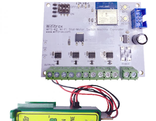 Switch machines are not included! WFS-42 Quad Wi-Fi Stall-motor Switch Machine Controller This module provides Wi-Fi control of four stall-motor switch machines such as the popular Tortoise from Circuitron and others. There are many ways to operate the turnouts controlled by the WFS-42. The simplest is to connect a browser to the WFS-42 web pages and operate the turnouts by tapping buttons on the web page. You'll probably use this for initial checkout. But to make best use of one or more WFS-42, you'll need a Wifitrax WFD-60 Wi-Fi and DCC Gateway. This device discovers and controls a set of WFS-42 (or other Wifitrax WFS series) to provide centalized control. The WFD-60 provides a WiThrottle server so that you can use an app such as Engine Driver or WiThrottle or a device like TCS UWT-100/50 to control turnouts. You'll likely use this method if you are using a WFD-60 to control large-scale locomotives. The WFD-60 also provides a DCC input, so you can use an existing DCC Command Station/Booster to control your turnouts by simple connecting its Track DCC output to the WFD-60 DCC input But that's not all. The WFD-60 also provides its own set of customizeable schematic panels so that you can build a schematic diagram of all or part of your layout and control your turnouts by clicking or tapping on the turnout image in the panel. Please read the Quick Start Document or Full Manual to see diagrams of typical usage. The WFS-42 can operate stall-motor switch machines only. It does not have its own DCC input but relies on the WFD-60 to accept DCC for a collection of WFS-42 modules. DIP Switches on the WFS-42 module allow a range of output voltages to be selected. With this module you can use Wi-Fi to control up to four stall-motor switch machine channels in many different ways (1) Use its internally generated web pages on any browser, (2) Use a Wifitrax WFD-60 with its schematic layout panels to control a set of WFS-42s each with 4 turnouts, (3) Use any DCC Command Station/Booster into the Wifitrax WFD-60 to control those same turnouts, (4) Use a Wifitrax WFD-30 or 31 together with an NCE Command Station/Booster and WFD-60 with an app such as Engine Driver, WiThrottle or the TCS UWT-100/50, (5) Use a Wifitrax Command Station/Booster, WFD-60 plus the same apps. (6) Use our free Tower Operator App. This app controls four of your model railroad switches by tapping a switch symbol on the custom layout map you build on your Windows 10 or Android computer or tablet. |